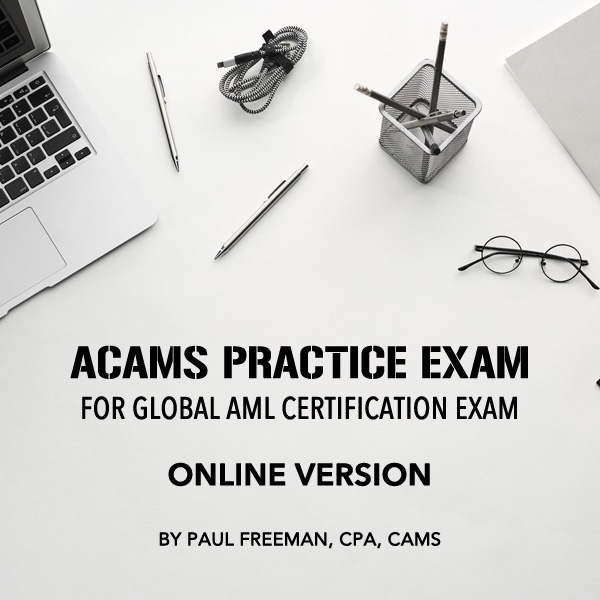This 120 questions Practice Exam serves as a guide and tool to candidates who want to take the Certified Anti-Money Laundering Specialists (CAMS) certification exam, and it is the ONLY web-based, full-length practice test. It not only tests the candidate’s knowledge base, but also prepares him/her for the physiological rigors of the exam.